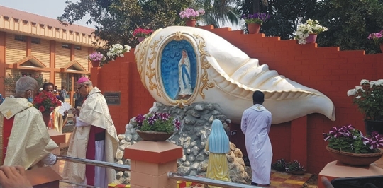 3 February, 2021, Bolpur (Kolkata): The Infant Jesus Church of Makrampur at Shantiniketan has installed a Station of The Cross – depicting the crucifixion of Christ – and a grotto in the shape of a conch shell dedicated to the Lady of Lourdes.
